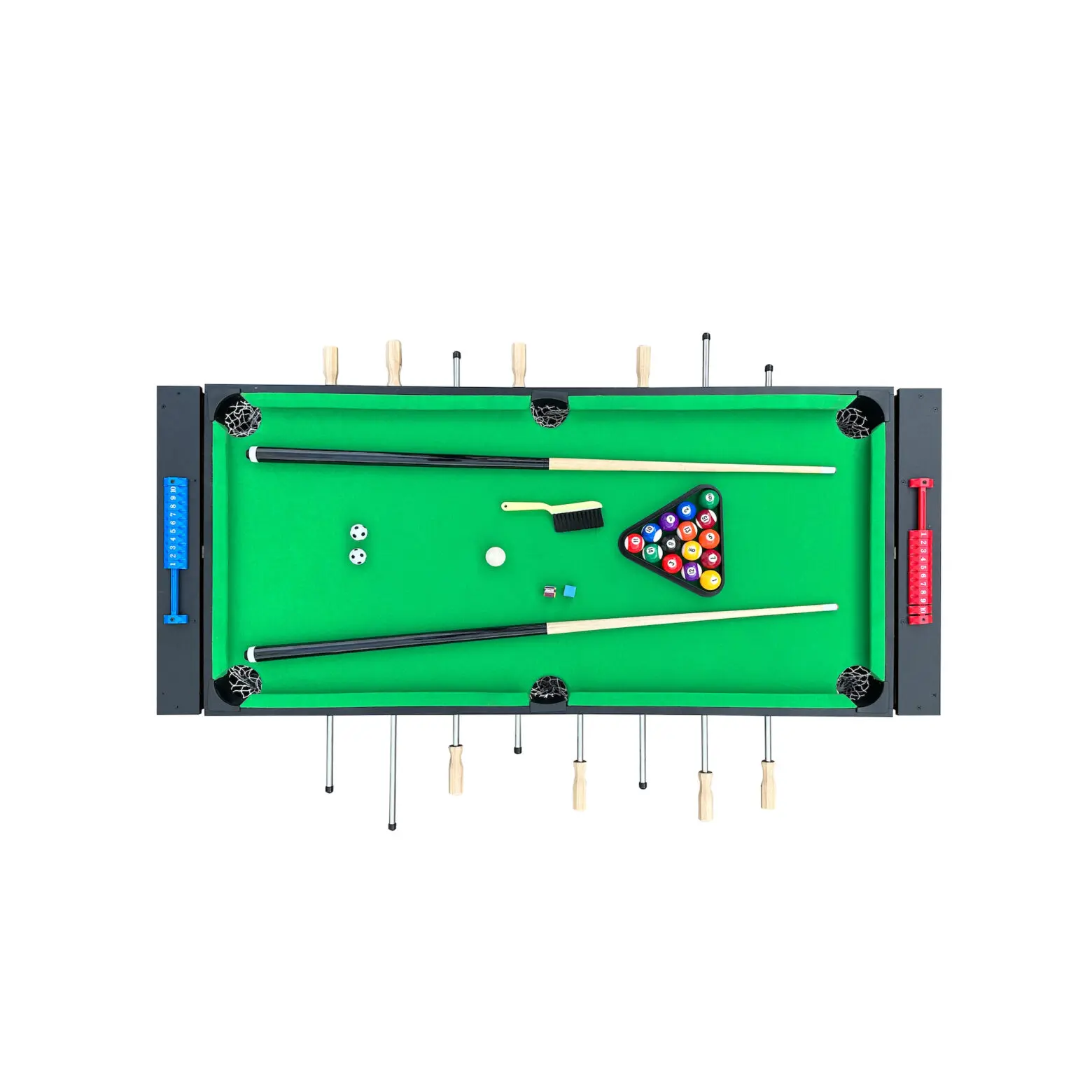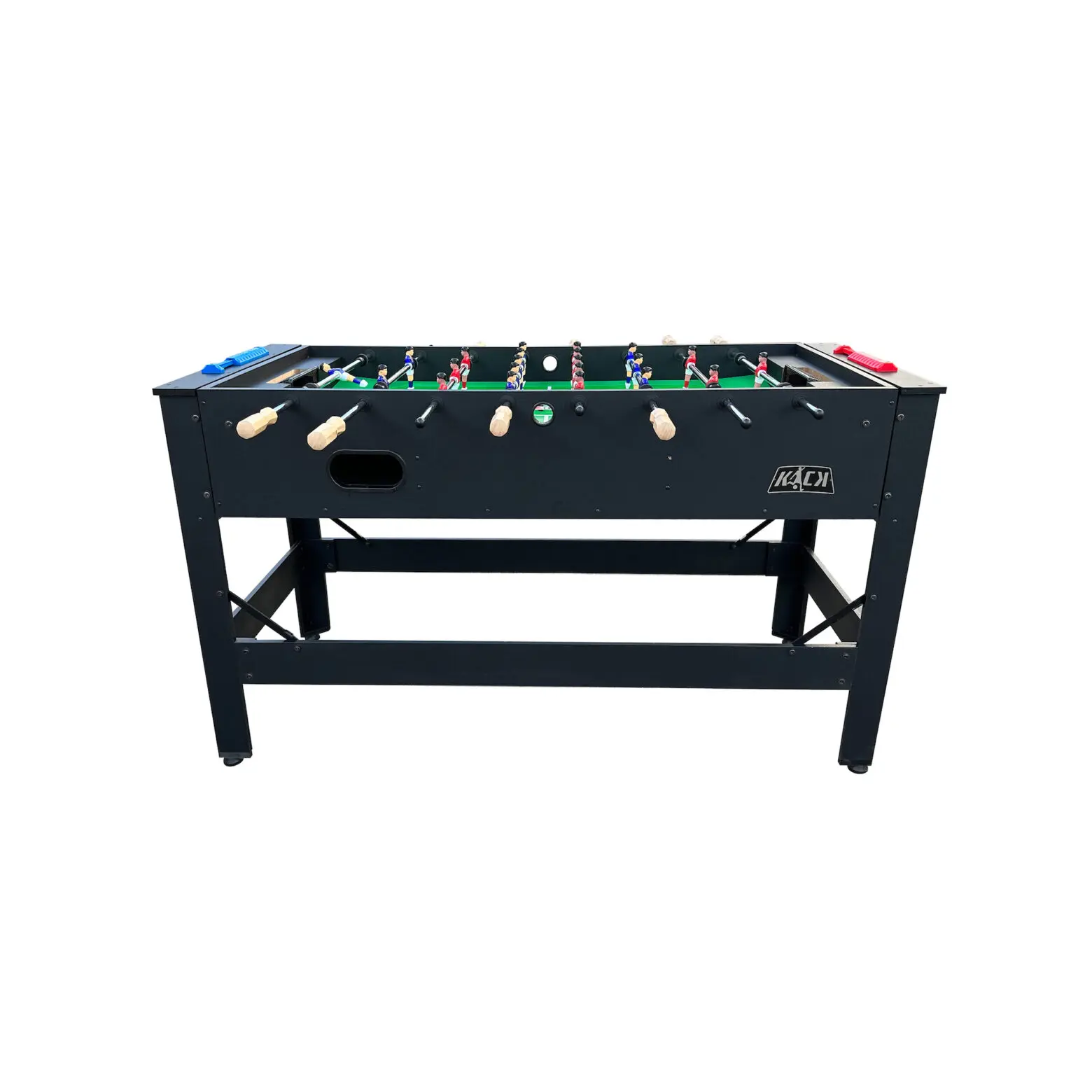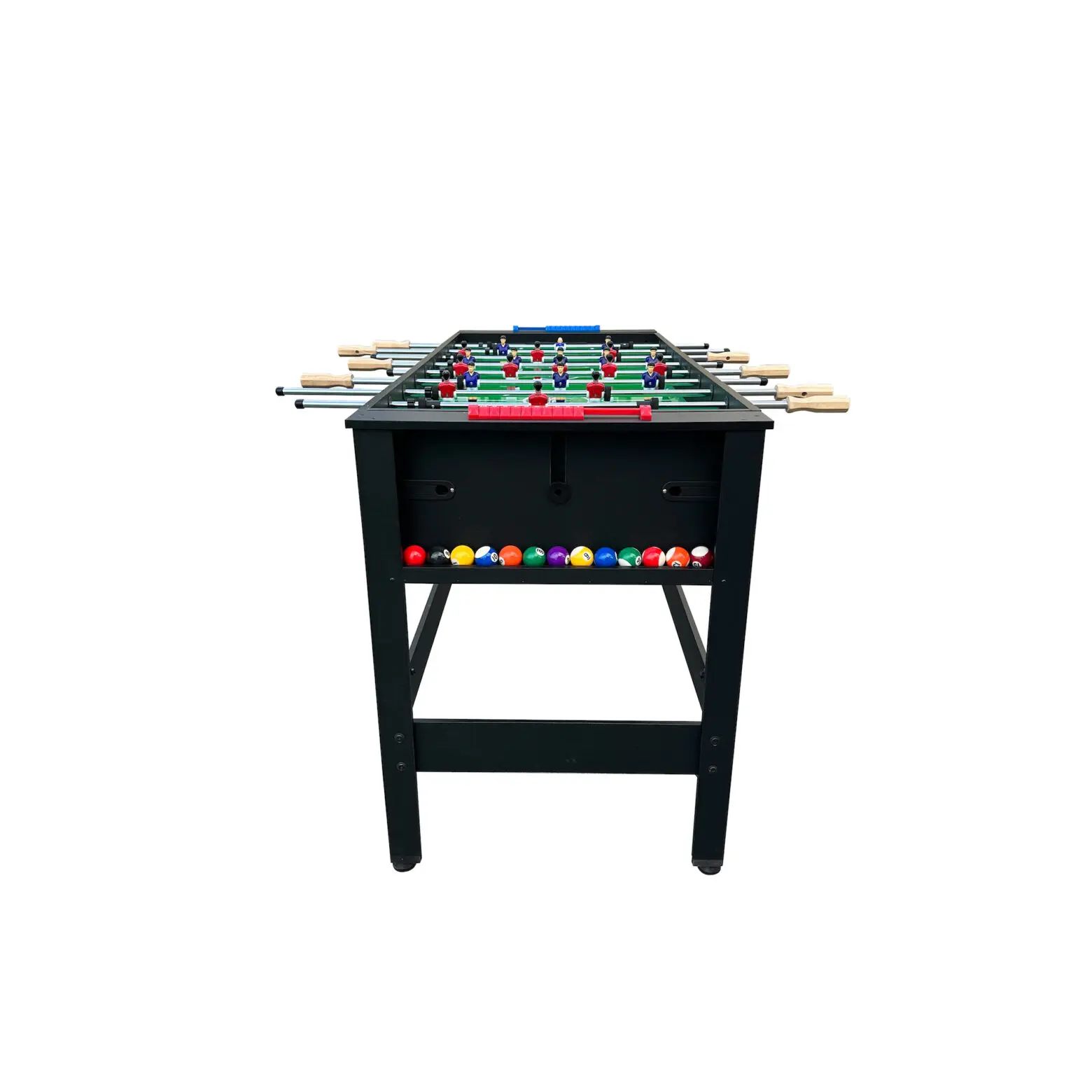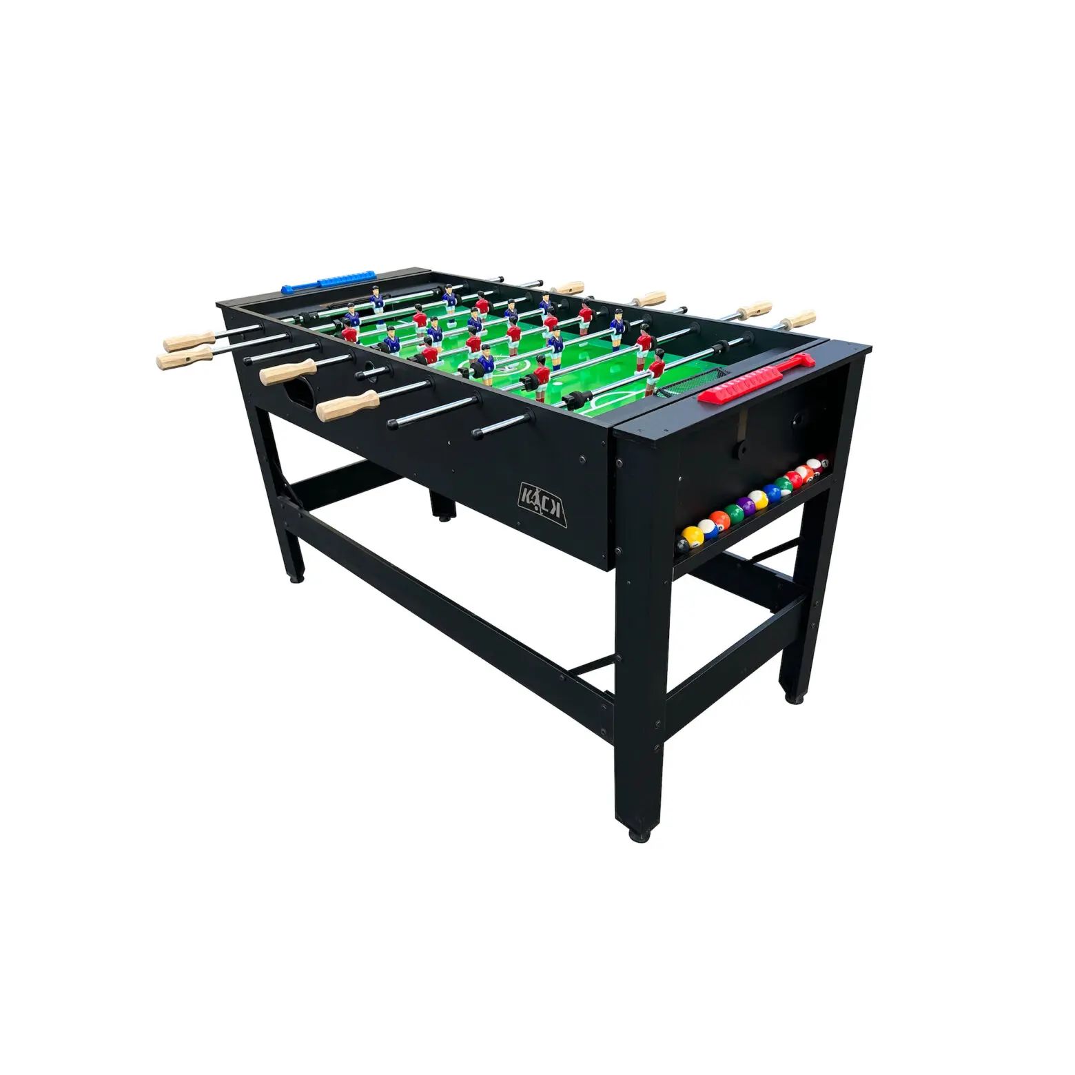Discover the incredible craftsmanship of the KICK Twain 48" 2-in-1 Multi Game Table. A genuine masterpiece of multi-game innovation, designed to elevate your game room with exceptional excellence. Enjoy exciting billiards/pool or foosball sessions with your loved ones, all conveniently built into this single table to save space. The square leg design and 42-mm plastic leg levelers ensure a strong structure and a perfectly even playing surface. With its durable construction, this game table ensures hours of captivating play, with each match delivering an extraordinary gaming experience. Moreover, its thoughtful design caters to players of all ages, making it a versatile addition suitable for both kids and adults.